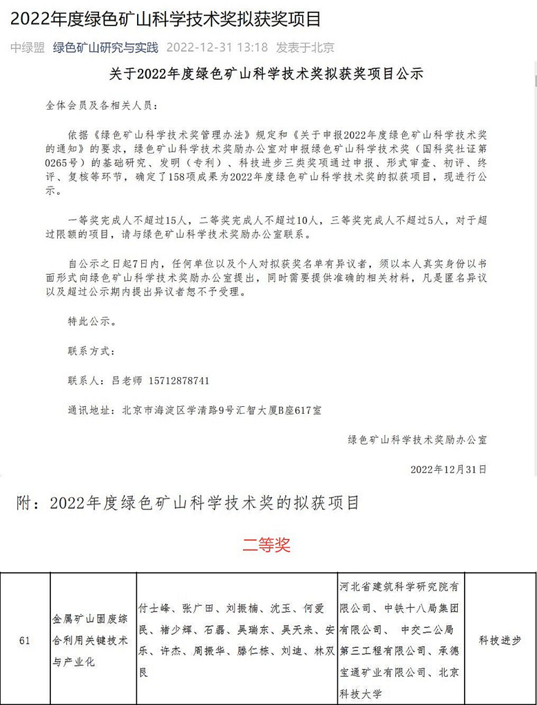 我公司申報的“金屬礦山固廢綜合利用關(guān)鍵技術(shù)與產(chǎn)業(yè)化”項目依據(jù)《綠色礦山科學技術(shù)獎管理辦法》規(guī)定和《關(guān)于申報2022年度綠色礦山科學技術(shù)獎的通知》的要求,經(jīng)綠色礦山科學技術(shù)獎勵辦公室對申報綠色礦山科學技術(shù)獎(國科獎社證第0265號)的基礎(chǔ)研究、發(fā)明(專利)、科技進步三類獎項通過申報、形式審查、初評、終評、復(fù)核等環(huán)節(jié),確定我公司申報的“金屬礦山固廢綜合利用關(guān)鍵技術(shù)與產(chǎn)業(yè)化”榮獲2022年度綠色礦山科學技術(shù)獎二等獎。